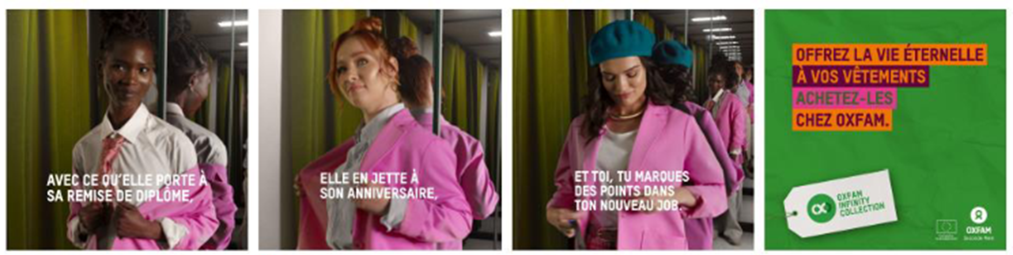 In Belgium, consumer awareness actions centred on the Infinity Collection campaign developed by Oxfam Belgium, aiming to extend clothing lifecycles by encouraging both donation and second-hand purchasing. Developed together with a creative agency, it was structured in two phases: a spring donation drive to build the collection, followed by a second phase during Second Hand September focusing on reuse and second-hand consumption as alternatives to fast fashion.